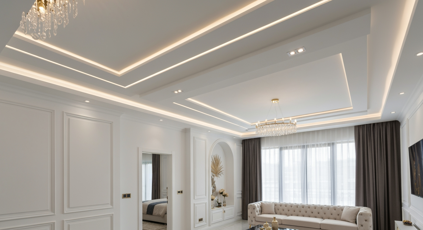 Premium false ceilings, elegant wallpapers, and sophisticated design elements